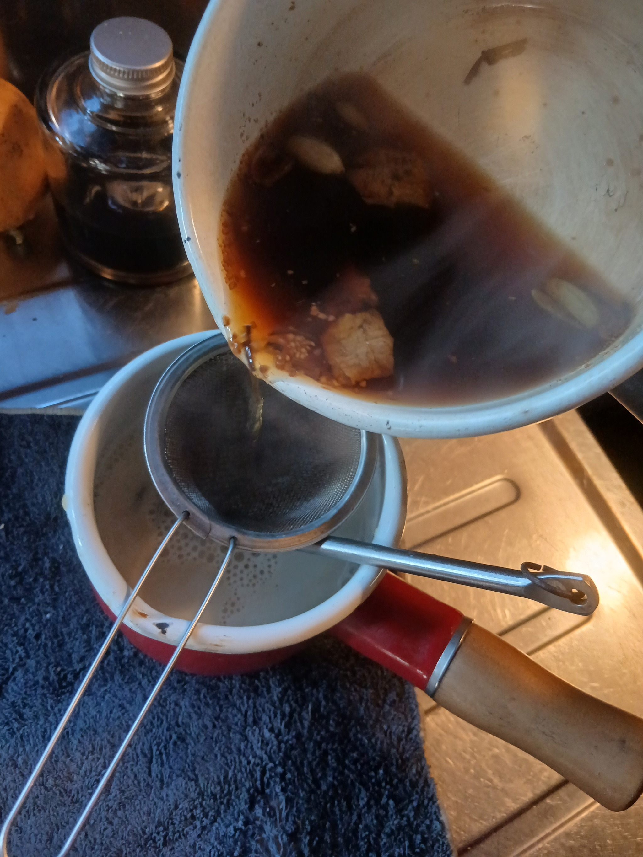 ミルクが温まったら、茶こしでスパイスティーをミルクの鍋に加えます。