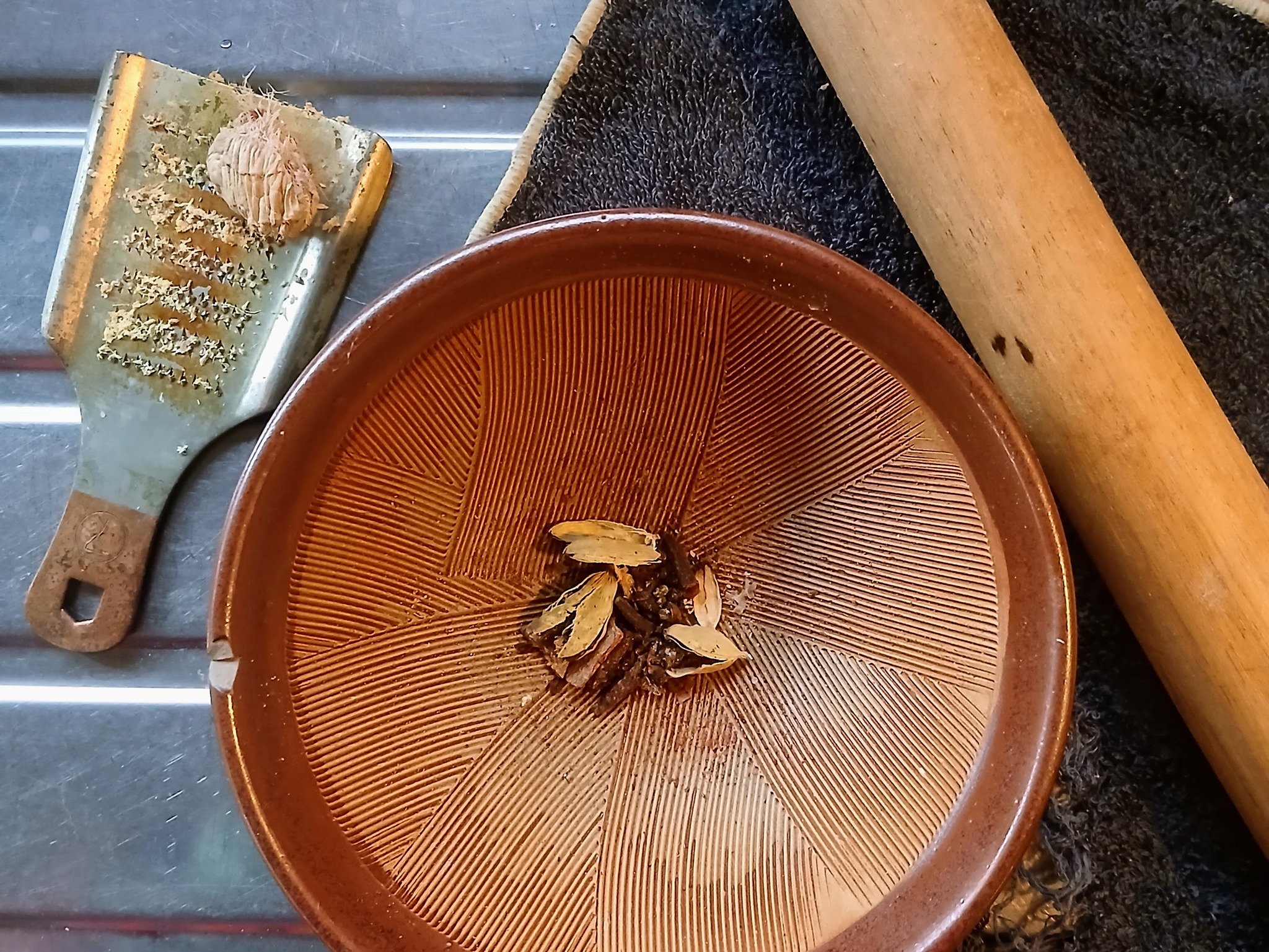 まず、スパイスを全部すり鉢などで潰します。こうするとスパイスの香りがぐっと高まります。生姜は乾燥のものがあると便利です。無いときは、生の生姜を皮ごと一緒に潰して使ってください。