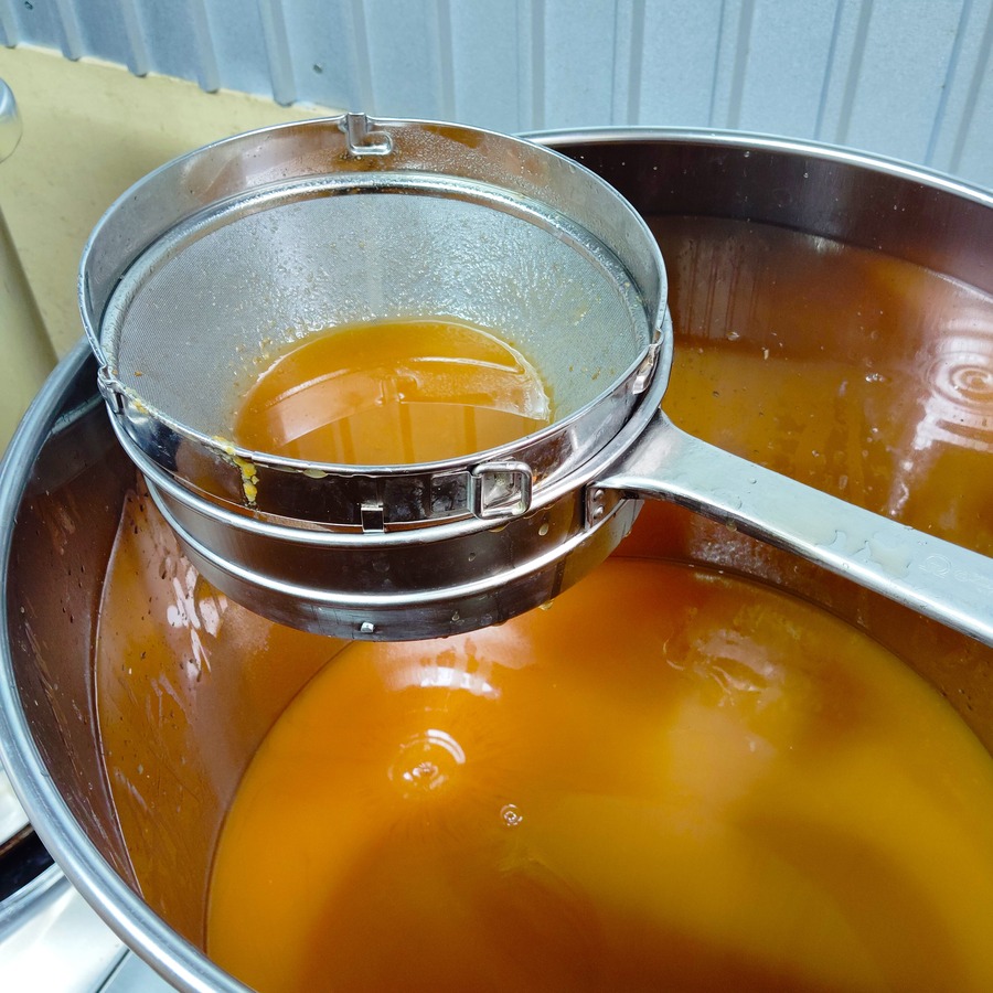 火入れが終わって、濾過を数回してシロップ液を取り出します。その後、瓶に充填して、熱殺菌を終えたら出来上がりです。