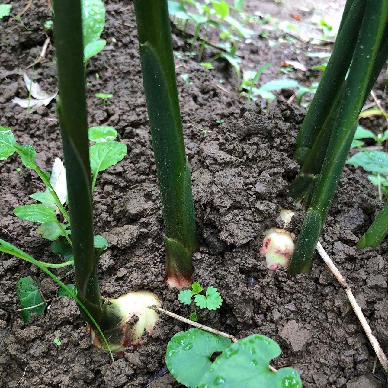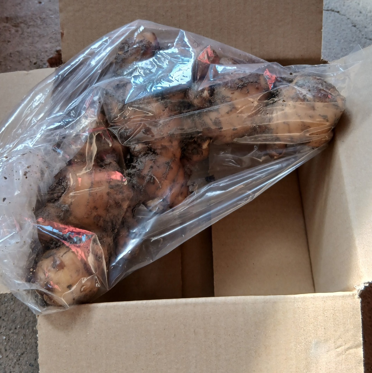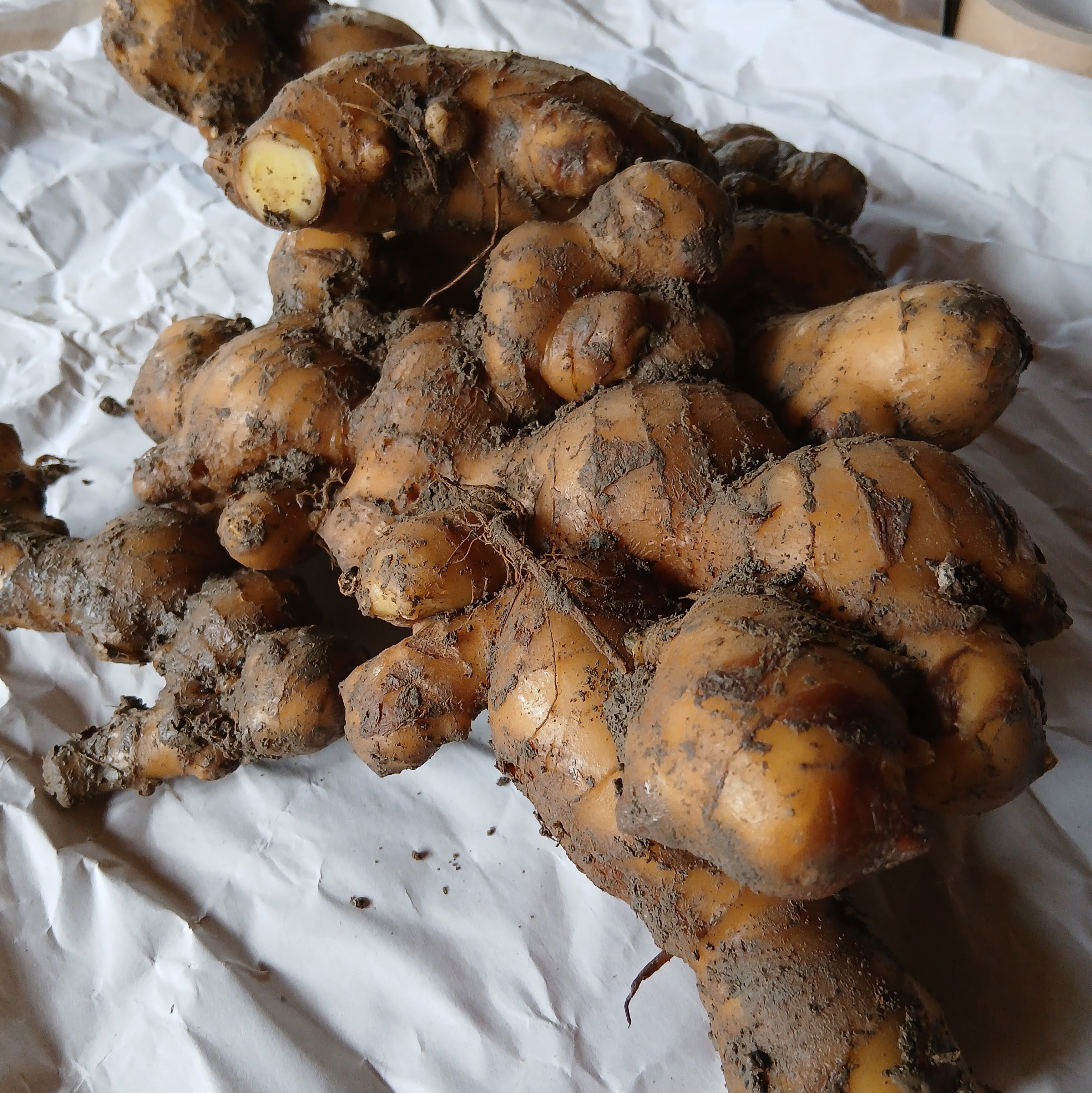 貯蔵して3週間ほど経った生姜です。茎もとは臍の緒のように、自然に落ちていきます。この頃はまだ新生姜の感じが残っていますね。