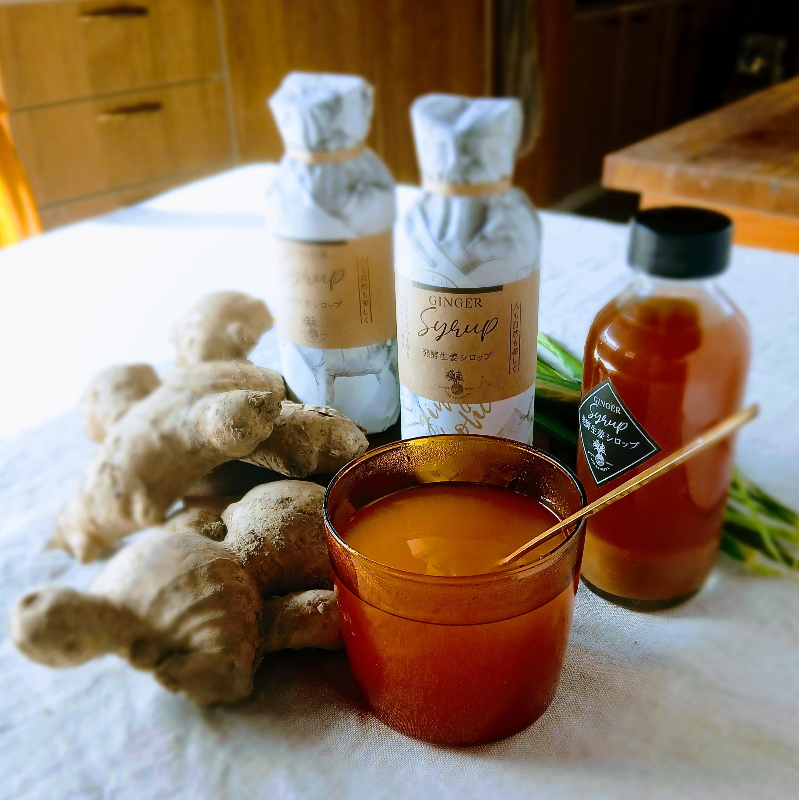 有機粗糖と自社栽培の親生姜を無化水で一月ほど自然発酵させてから、コトコトと3時間火にかけて辛味を引き出しています。熱い飲み物に入れても、冷たいドリンクに混ぜても美味しくいただけます。